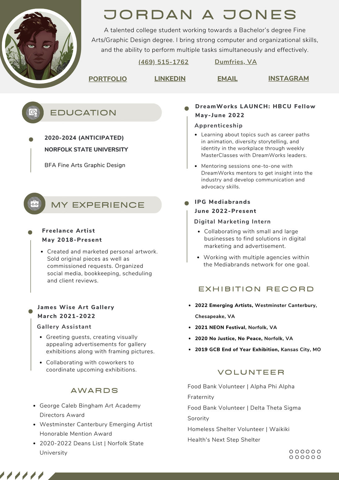 Jordan Allan Cuffee Jones was born into a military family on April 24th, 2002 where he was exposed to exploring the entire United States. He is a self-taught digital artist where his artwork vicariously reflects his personal life and focuses to represent the backgrounds of people he’s met throughout his childhood. After living in so many states within the US, he came to the conclusion that he can create a series of characters that represent the cultures around the country. His art journey is only beginning but he has had the opportunity to present his work during galleries in high school leading into college. He is the recipient of the George Caleb Bingham Art Academy Directors Award in 2019 and became a captain for the academy the following year. He had also won the Blue Springs Art League Scholarship in 2020, where he would be accepted into Norfolk State University the same year. Jordan may not be the most decorated artist coming out of high school, but he holds himself to a standard to where he can become better than he was the previous year. He is determined to aspire for greatness and nothing less.